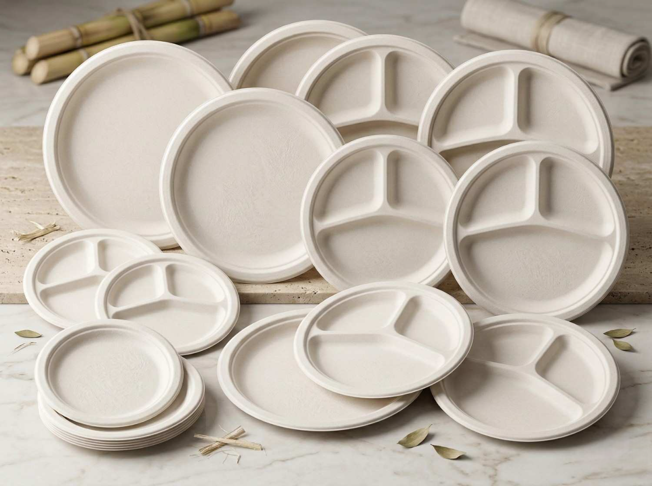 Discover our full range of eco-friendly sugarcane bagasse tableware. Fill out the form below to access the complete digital catalog.
